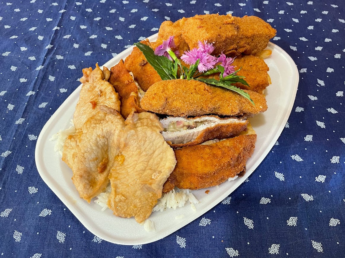 2db natúr szelet, 2db rántott szelet, 2db rántott köröm, 2db Aradi töltött szelet, vegyes köret
