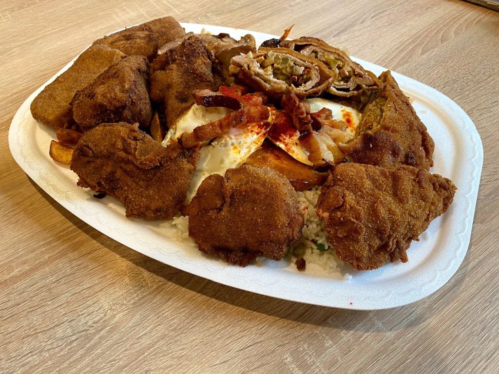 2db natúr szelet, 2db tükör tojás, 2db rántott köröm, 2db Aradi töltött szelet, csülök, 2db velő, 2db rántott sajt, párolt káposzta, vegyes köret
